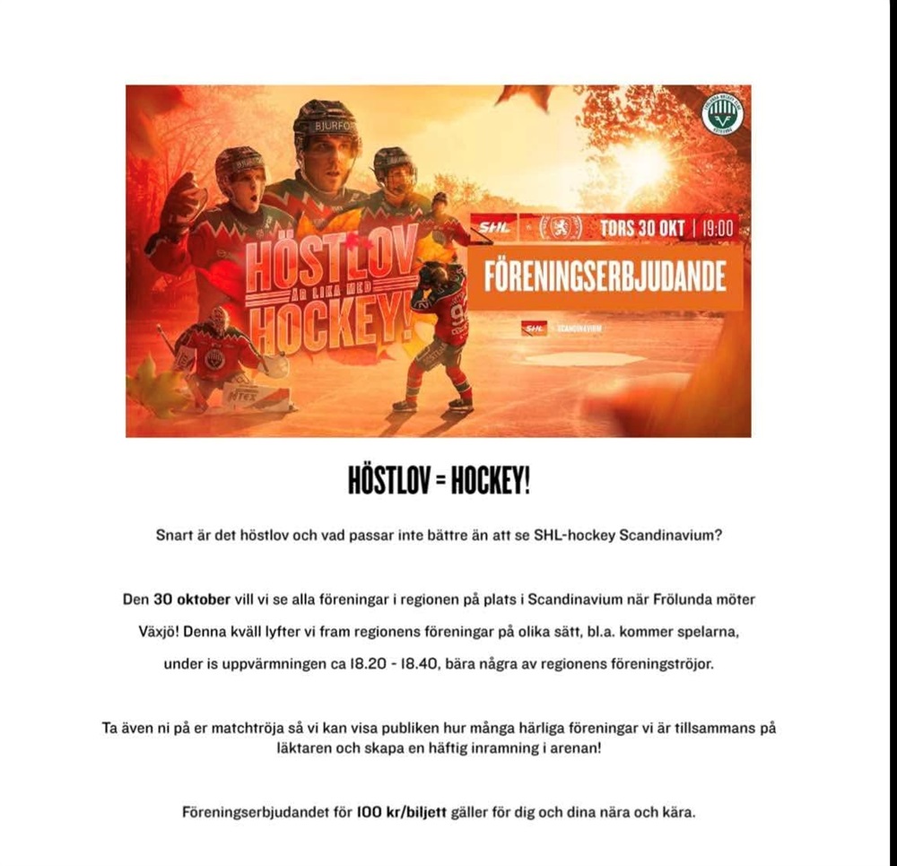Här kommer en rolig möjlighet att åka ner till Scandinavium och se Frölunda möta Växjö, den 30 oktober kl. 19.00.